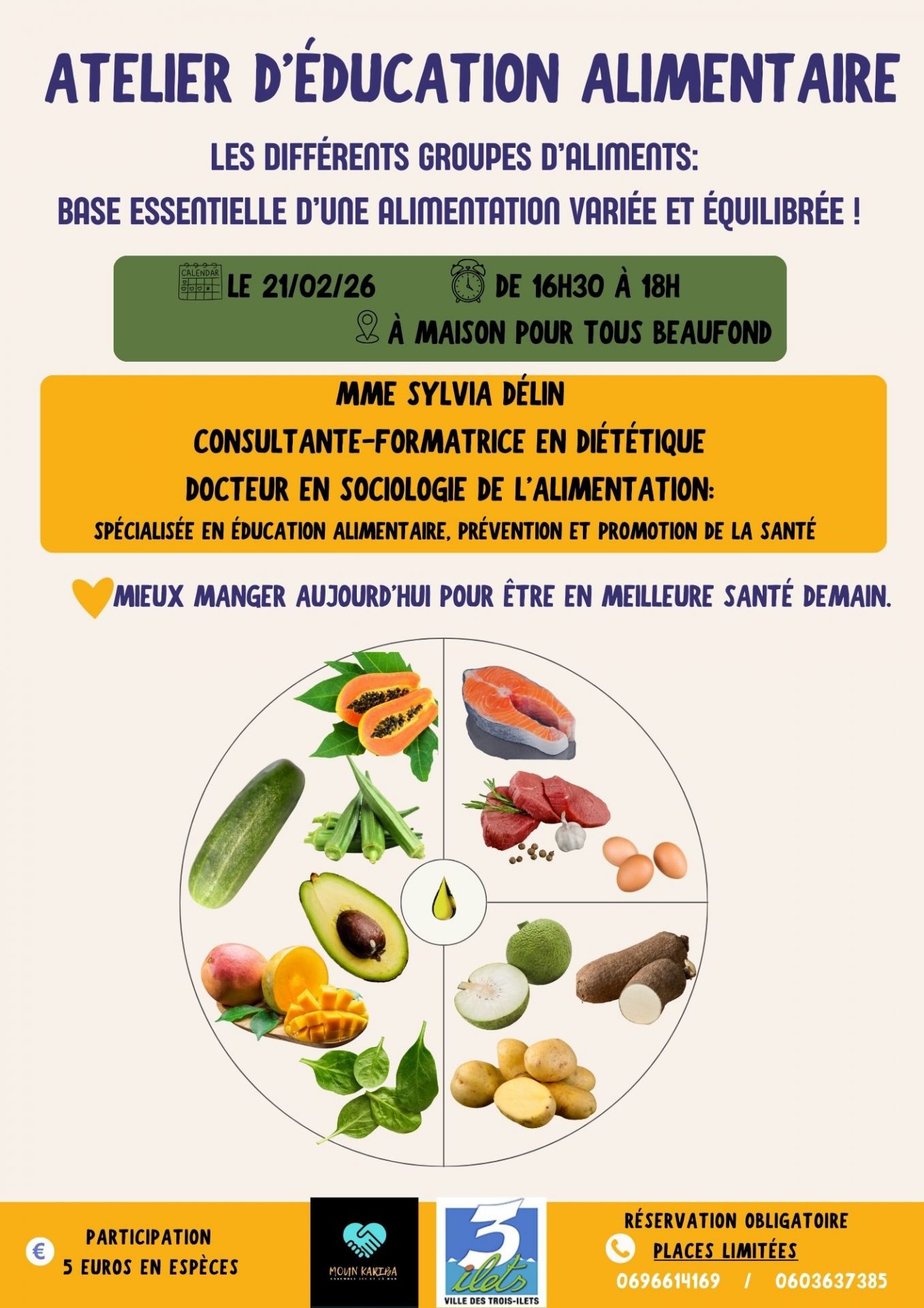 L’association MOUN KARIBA vous convie à un atelier d’éducation alimentaire animé par Sylvia DÉLIN, Consultante-formatrice en Diététique et Docteur en sociologie de l’alimentation, spécialisée en Éducation alimentaire, prévention et promotion de la santé « , intitulé : « Les différents groupes d’aliments : base essentielle d’une alimentation variée et équilibrée ! ».