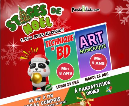 UNIQUEMENT sur notre site : 🐼🎅🏽 Les stages de la Noël sont ouverts pour les inscriptions! 🎄🎁 La formule sera 1 ou 2 jours complets à la carte ! (Pas de 1/2 journée) 📆QUAND ? • LUNDI 22 DÉCEMBRE (TECH BD/DESSIN) ⚠️ NOMBRE DE PLACES LIMITÉ • MARDI 23 DÉCEMBRE (ART NUM)⚠️ max 10 participants 🕗De 9h à 17h (accueil possible à partir de 8h30) THÈME DIFFÉRENT À CHAQUE STAGE !!!!🎄😍 📌Au menu : • Technique de BD & DESSIN avec une mini création «Strip » MIN 8 ans (accomplis) • Art Numérique (découverte et mini projet) 2D, 3D MIN 9 ans 📍OÛ: à Didier, PANDATTITUDE 📎TARIFS : (Repas, collation & matériel de stage TOUT compris) 1 jour : 56€ 2 jours : 108€ Tarif Family : 212€ https://www.pandattitude.com/accueil/stages-pandattitude/
