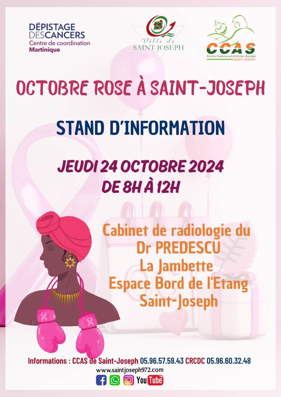 La Ville de SAINT-JOSEPH, en partenariat avec le Centre Régional de Coordination des Dépistages des Cancers de la Martinique (CRCDC Martinique), vous invite à un stand d’information et de prévention des cancers.