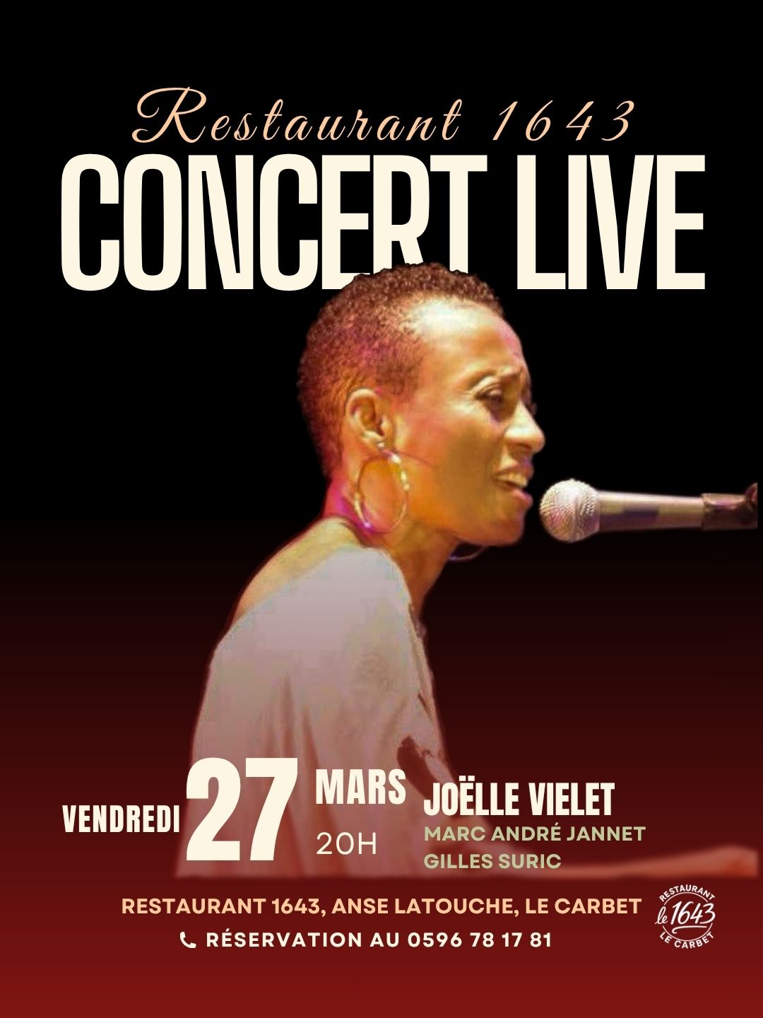 🎤Retrouvez Joëlle VIELET, Marc-André JEANNET et Gilles SURIC en concert live au Restaurant 1643.