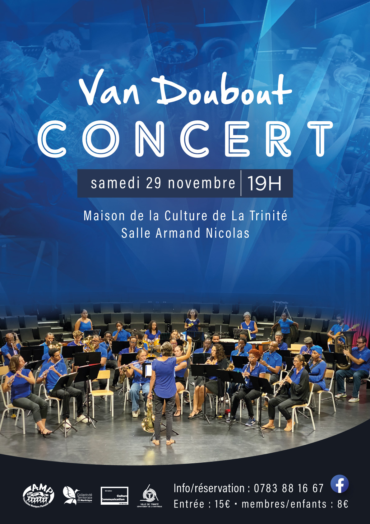 Concert de l’orchestre d’harmonie Van Doubout à la maison de la culture de Trinité (salle Armand Nicolas) le samedi 29 novembre à 19h00. Répertoire de musique locale et caribéenne. Arrangements inédits.