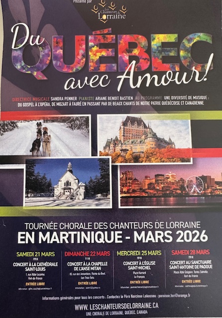 Du gospel à l’opéra, de Mozart à Fauré en passant par de beaux chants québécois et canadiens, les Chanteurs de Lorraine vous convient à un concert haut en couleur. 2 présentations à Fort-de-France, une aux Trois-Îlets et l’autre à Le François (détails sur l’affiche).