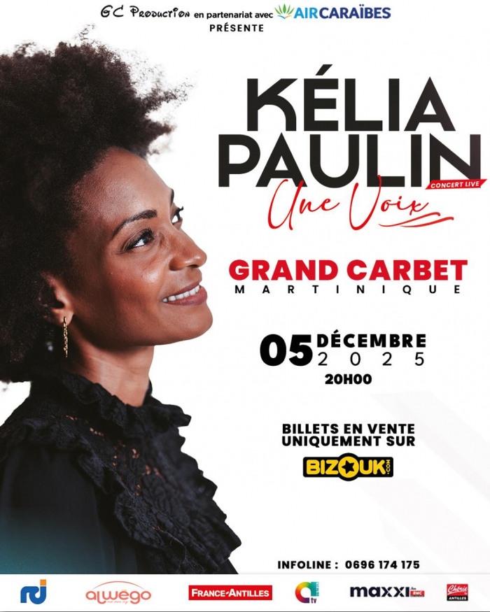 Ne manquez pas l’événement musical de l’année ! Kélia Paulin, la sensation montante de la scène, se produira en live pour une soirée inoubliable. Le 5 décembre 2025 au Grand Carbet à 20h. Rentrez dans son univers où se mêlent sensibilité, humanité et bonté. Kélia Paulin, la voix !