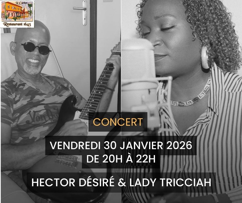 De 20h à 22h, Hector Désiré & Lady Tricciah s’invitent au restaurant pour un concert tout en groove, entre voix envoûtante et guitare inspirée.