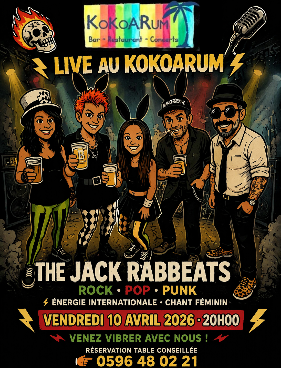 Marquez vos calendriers : le jeudi 10 avril à 20h, la soirée s’annonce électrique !Si vous aimez le rock pur, le rock féminin et l’énergie brute, vous allez être servis. The Jack Rabbeats prend les commandes pour un live qui va faire trembler les murs : Des riffs de guitares acérés ! Des lignes de basse qui cognent ! Une batterie survitaminée ! Des voix puissantes et habitées ! C’est la recette parfaite pour démarrer l’année en mode Rock’n’Roll ! ENTRÉE GRATUITE Jeudi 10 avril 20h00 Kokoarum