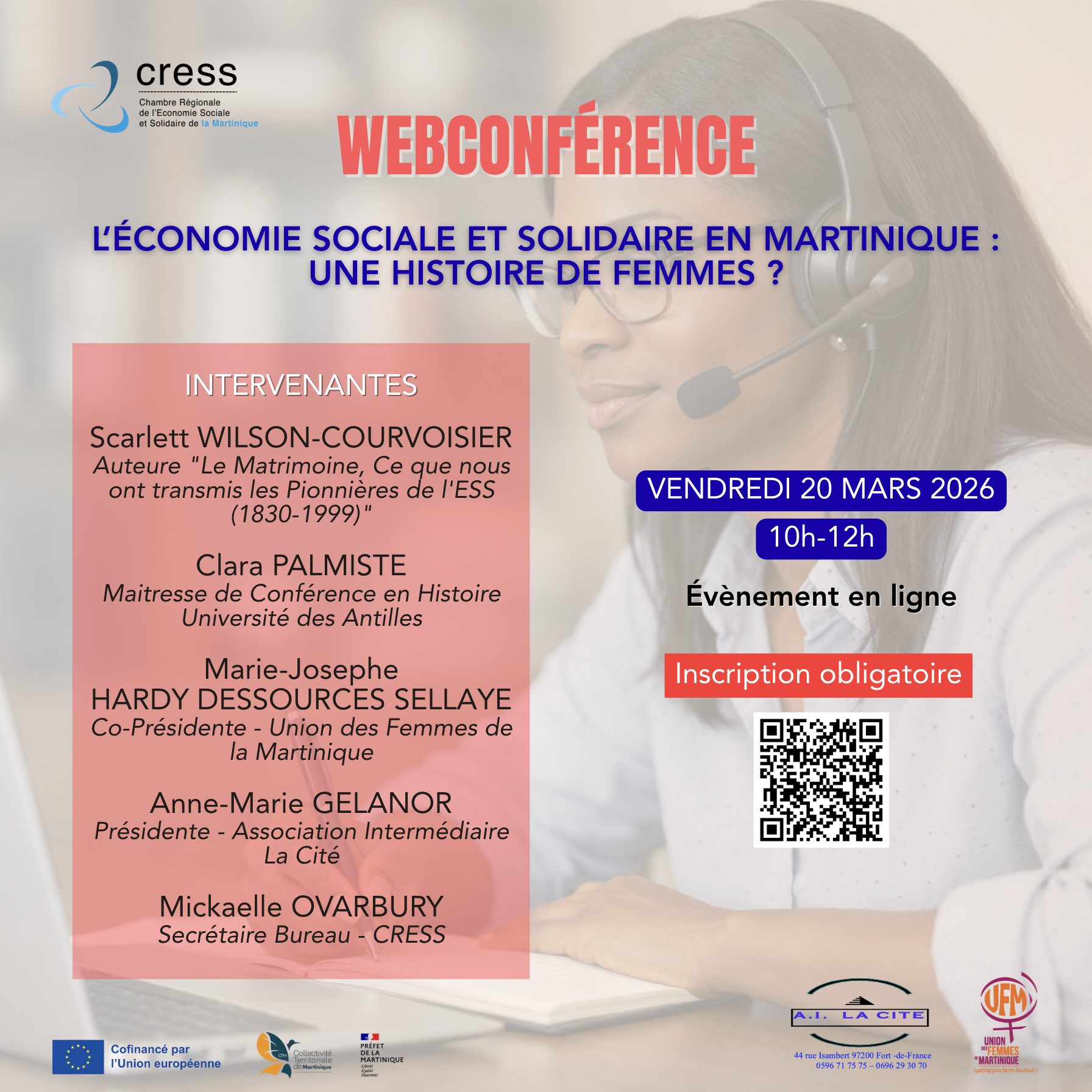 La Chambre Régionale de l’Economie Sociale et Solidaire (CRESS) de la Martinique vous convie Vendredi 20 Mars 2026 de 10h00 à 12h00 à une webconférence autour de la thématique : « L’Economie Sociale et Solidaire en Martinique : une histoire de femmes ? »