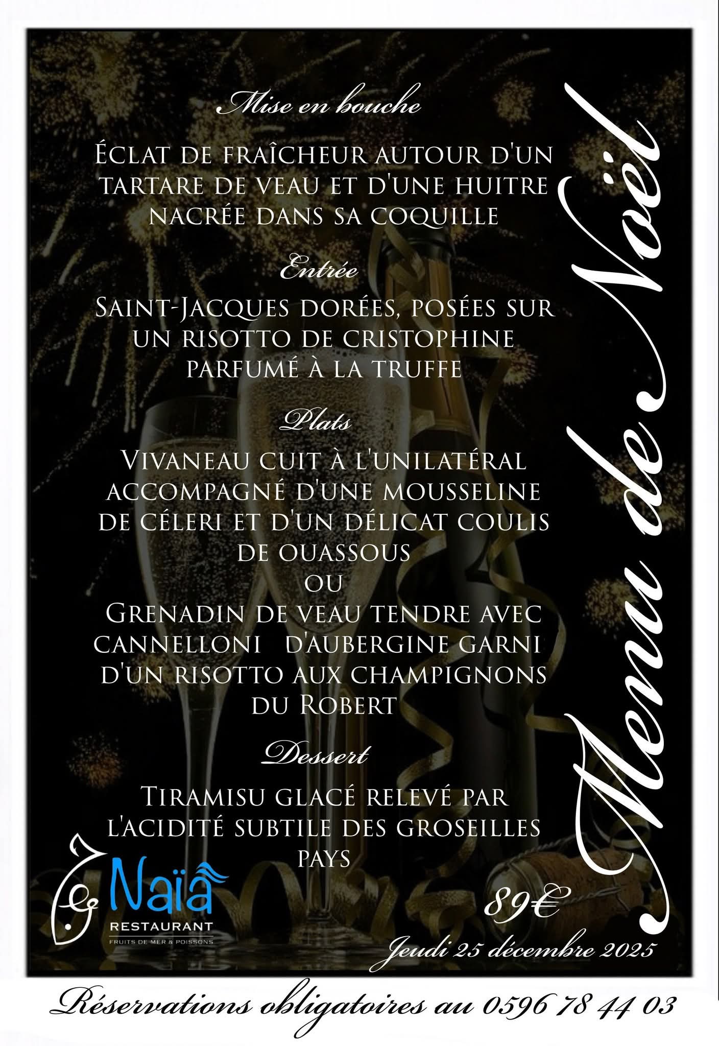 Venez découvrir le NAÏA, restaurant de fruits de mer et poissons ( provenant de la peche locale) au Marin, langoustes grillées et menu langouste. Avec une vue imprenable sur la marina.Vous pouvez découvrir la carte et les avis sur Google. Notre menu de Noël est disponible. A bientôt