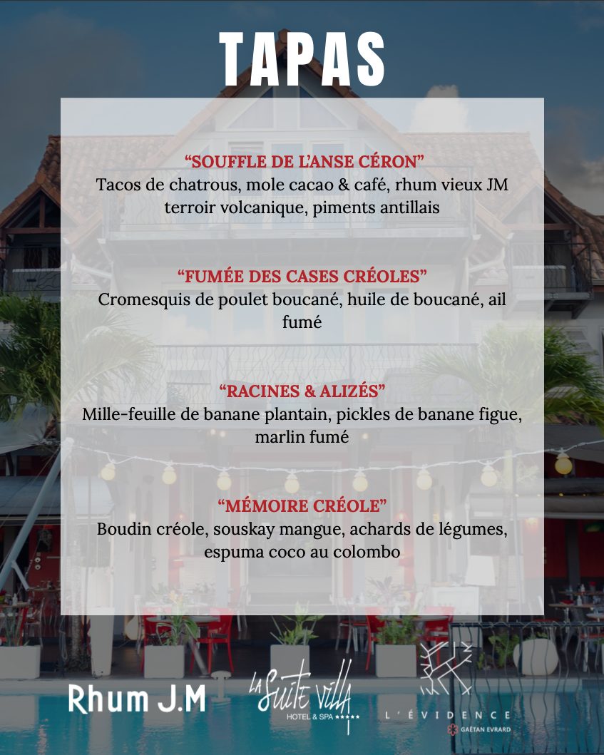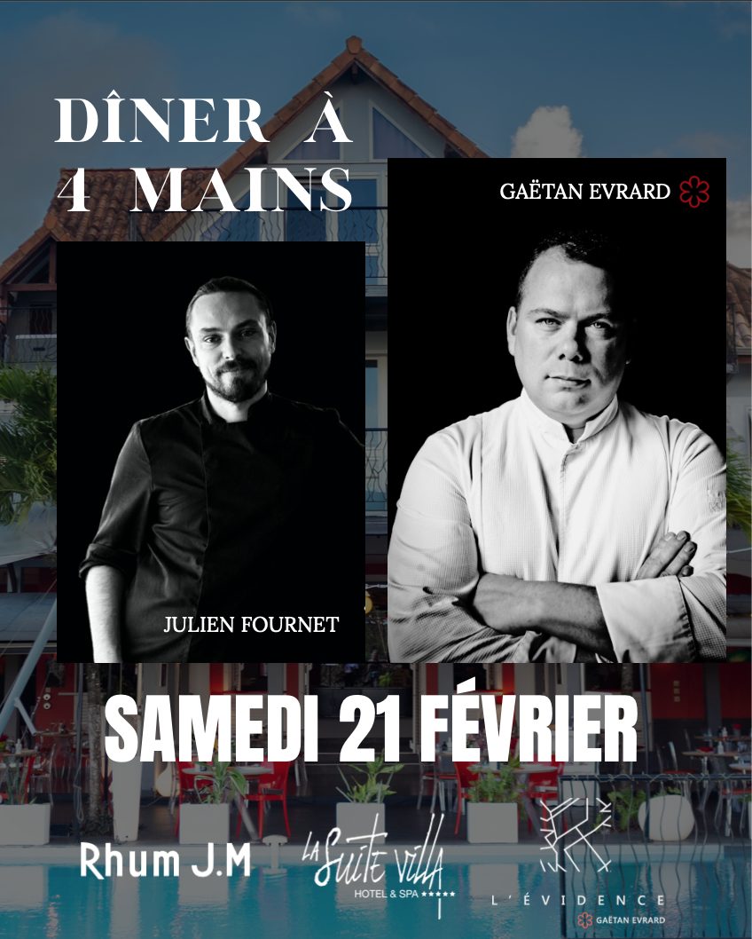 La Suite Villa vous invite à vivre une expérience gastronomique unique, lors d’un dîner à 4 mains réunissant notre chef Julien FOURNET et le chef étoilé Gaëtan EVRARD , autour d’une vision commune : sublimer les produits de Martinique et le respect du terroir.