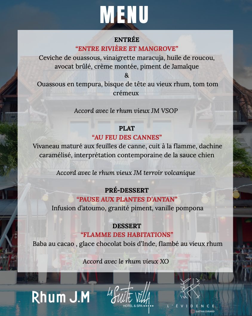 -Menu unique + accords mets et rhums (à partir de 19h30): 75€ / personne