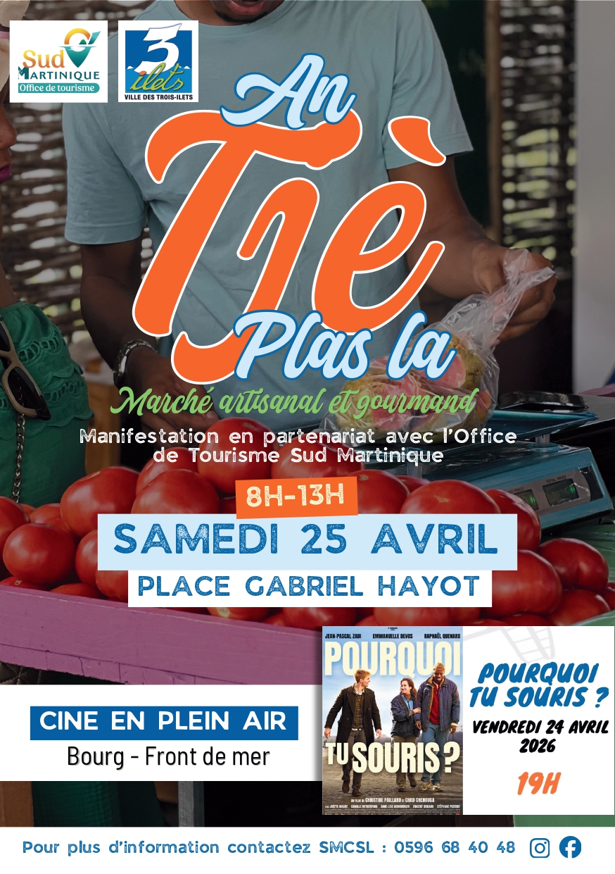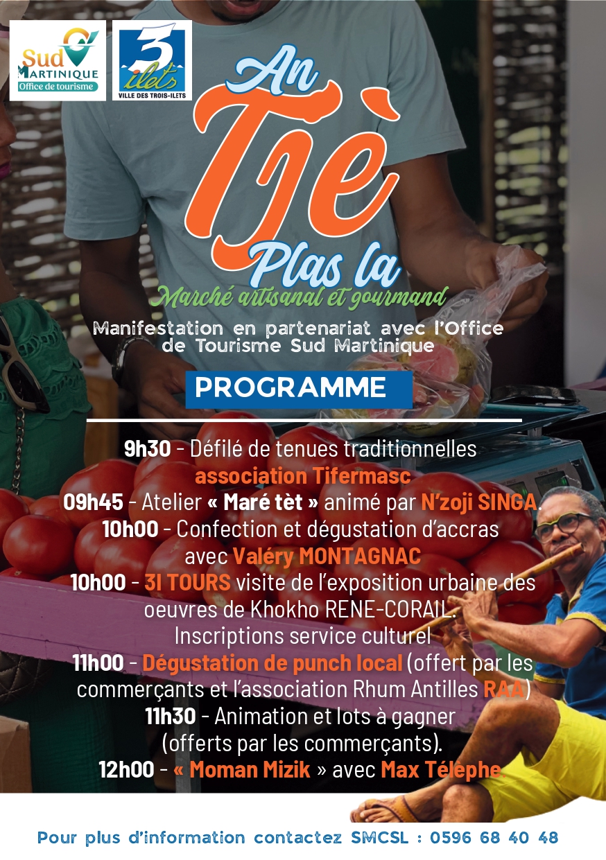 Dans le cadre de sa programmation culturelle, la Ville des Trois‑Îlets, en partenariat avec l’Office de Tourisme Sud Martinique, invite le public à « An Tjè Plas La », un marché artisanal et gourmand ouvert à tous.