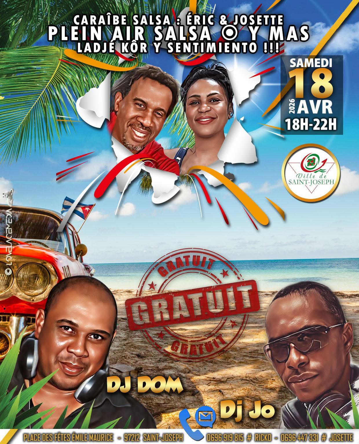 📌 *ERIC & JOSETTE* de l’association *CARAÏBE SALSA💃🏾🕺🏾* vous convient à leur *AMBIANCE LADJÉ KÔR Y SENTIMIENTO* en *PLEIN AIR , SALSA* , le *samedi 18 avril 2026* de *🕕18h à 🕙22h*, sur la *PLACE DES FÊTES* 🪘💃🏾.