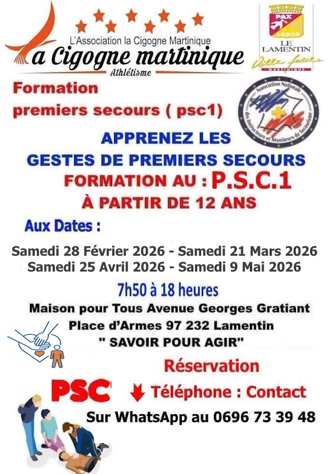 L’Association La Cigogne MARTINIQUE, en partenariat avec La ville du Lamentin l’ASSOCIATION NATIONALE DES INSTRUCTEURS MONITEURS DE SECOURISME, représentée par la DÉLÉGATION ANIMS 972, organise une formation de PSC1 (formation de secourisme) pour le grand public à partir de 12 ans.