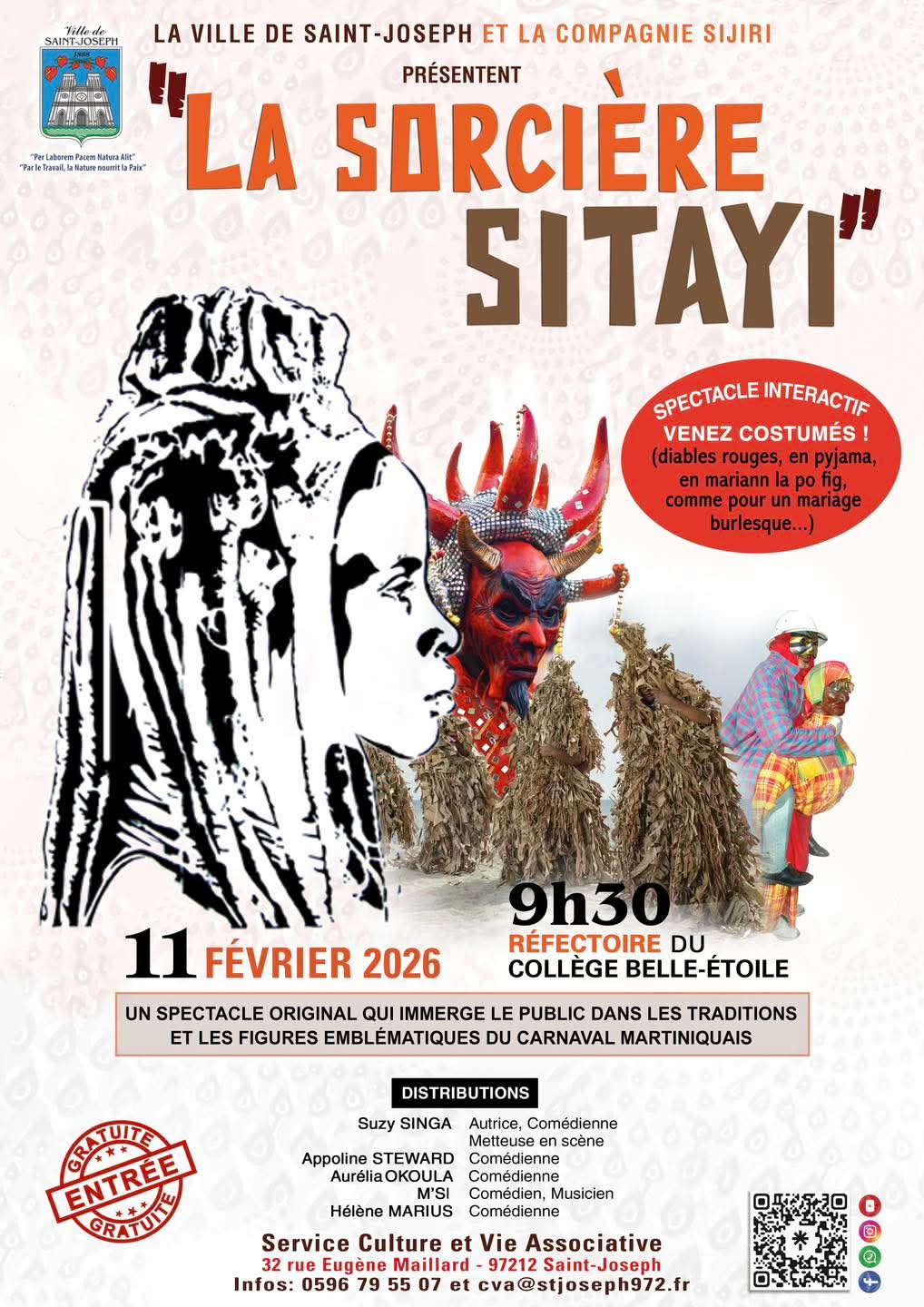 La Ville de Saint‑Joseph et la Compagnie Sijiri vous donnent rendez‑vous pour un Spectacle Interactif qui vous plongera au cœur des traditions et des personnages emblématiques du Carnaval martiniquais.
