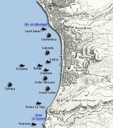 Voilier trois-mâts victime d’une voie d’eau dans la rade de saint-Pierre, que l’équipage a combattu pendant deux jours. A été remorqué jusqu’à l’anse Turin où il a été échoué.