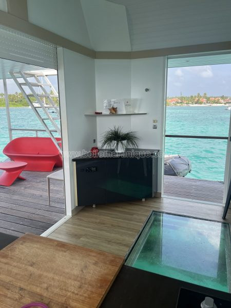 Profitez de votre villa flottante parfaitement équipée : Cuisine aménagée avec sol en verre, 2 chambres doubles, terrasse , solarium, barbecue, hamac, projecteur sous marin et également mise à votre disposition d une annexe à moteur thermique sans permis pour tous vos déplacements vers la terre ferme .