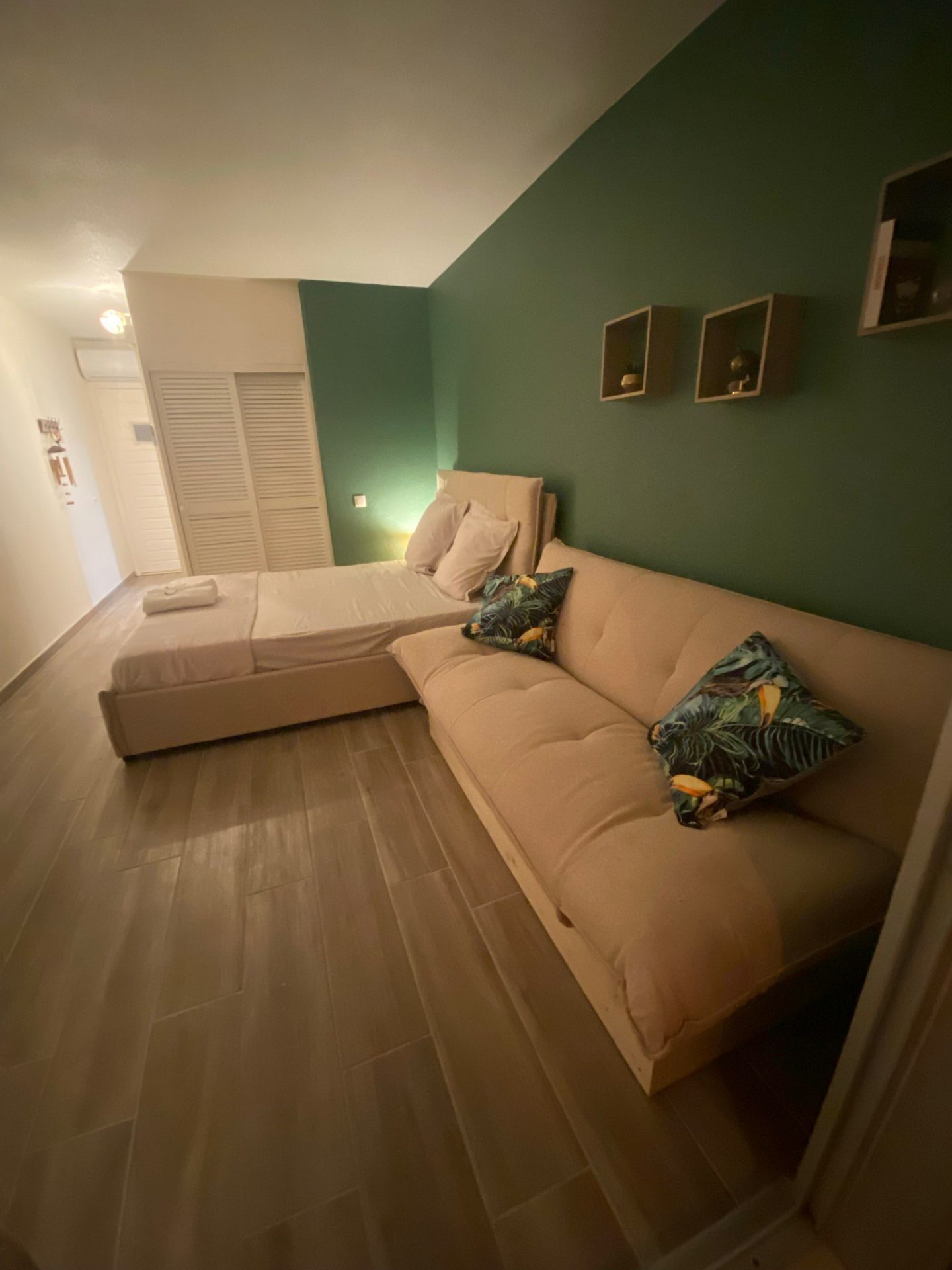 1 pièce avec un lit 160×200 et un canapé lit (pouvant accueillir deux jeunes enfants)+une chauffeuse dépliante en supplément.