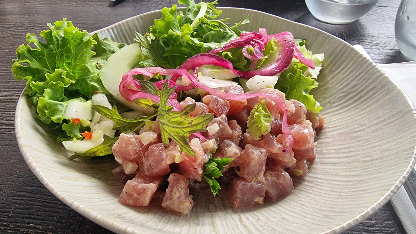 Nous nous sommes régalés avec un tartare de poisson frais, délicatement posé sur un lit de salade croquante, concombre, radis et oignons rouges, le tout accompagné de frites dorées à souhait. Un vrai délice !