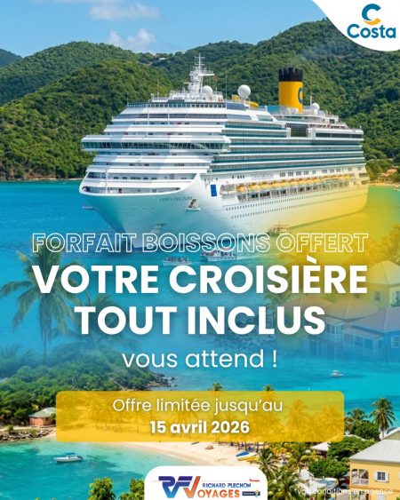 Embarquez pour une croisière Costa où tout est déjà prévu : détente, paysages paradisiaques et forfait boissons offert pour profiter pleinement de chaque instant à bord 🍹